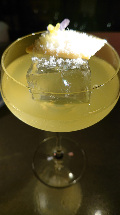 9杯めはメスカル、柚子、カモミール、トリュフ、シャリュトリューズ、フレンチベルモットとコンテチーズとチェダークリスプのカクテルですね。