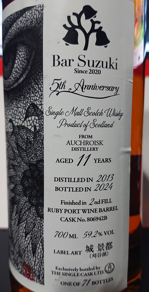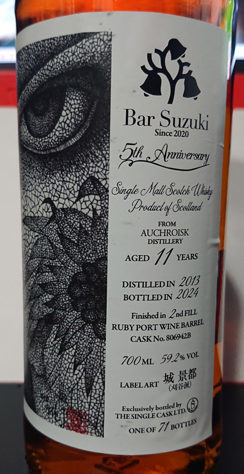 今回は馴染みのバーである、愛知県刈谷市のBarSuzuki(バースズキ)さんの5周年記念でリリースされたザシングルキャスクさんの協力でリリースされたオスロスク、2013年蒸留、11年、59.2度ですが、2ndFillルビーポートワイン樽でフィニッシュされたものになります。